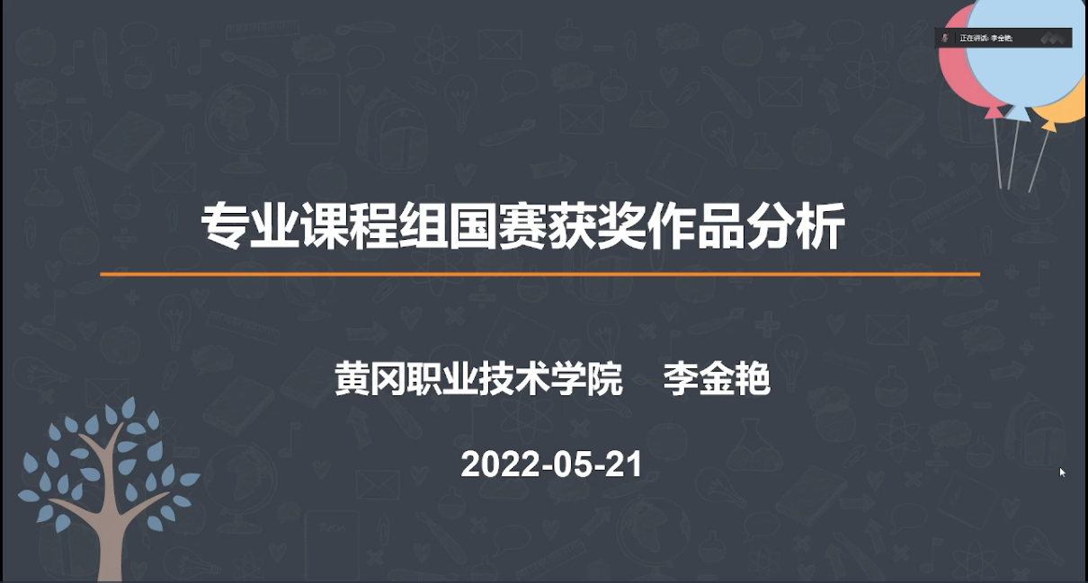 “国赛”一等奖获得者李金艳老师从课程重构内容、设计特色创新、撰写网评材料三方面做了以专业课程组国赛获奖作品分析为题的分享。