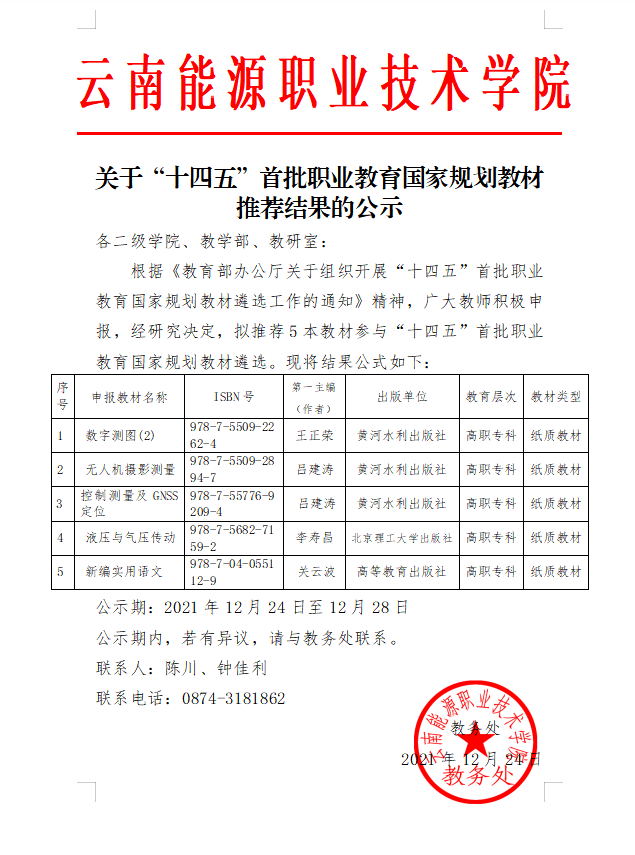 关于“十四五”首批职业教育国家规划教材推荐结果的公示