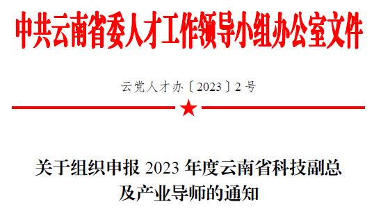 为深入贯彻落实党的二十大精神,推动创新链产业链资金链人才链深度融合,进一步引导广大人才服务和支撑云南现代产业体系建设,中共云南省委人才工作领导小组组织申报2023年度云南省科技副总及产业导师。经学校积极申报,经过遴选、公示,我校获批1个云南省产业导师名额。