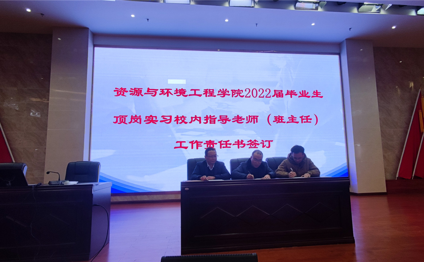 资源与环境工程江南广告 院长王祥邦、党支部副书记李鸿维与毕业班班主任签订顶岗实习校内指导教师(班主任)工作责任书并对毕业班班主任提出相关工作要求。