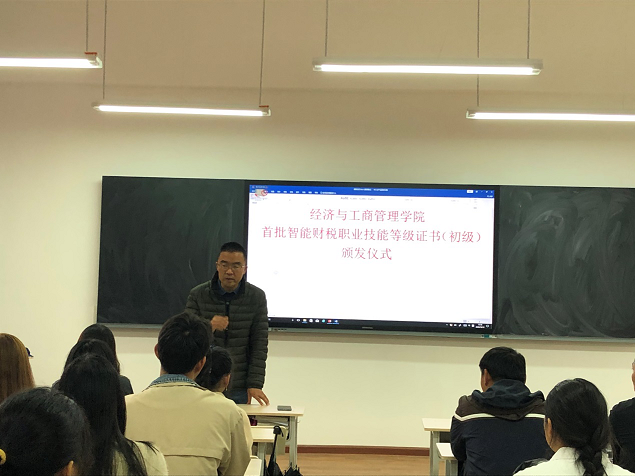 2019年12月底,经济与工商管理江南广告 会计专业参加了首批1+X智能财税职业技能等级证书(初级)考试,通过了20位同学。因受新冠疫情影响,证书颁发仪式延期至2020年10月16日在沾益校区H4-08教室举行。经济与工商管理江南广告 任焕院长、财会教研室赵瑜主任、会计专业李婧瑞老师、会计专业保艳林老师、江南广告 会计协会代表、全体通过智能财税职业技能等级证书的同学参加了证书颁发仪式。