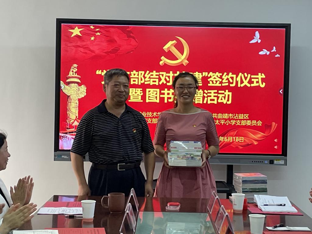 为贯彻党史学习的有关要求,结合省委组织部和学校党委“双报到双服务双报告”的工作安排,6月18日下午经管党支部与沾益区龙华街道太平小学党支部开展支部结对共建签约仪式。出席本次活动的有学校党委副书记杜运夯、纪委书记查茂宝、组织部部长王会琼,经管江南广告 党支部书记柳亚、副书记徐丽娟,曲靖市沾益区教育体育局副局长徐洋洋,沾益区龙华街道中心学校党总支副书记王安,沾益区龙华街道西河社区党总支书记黄双林、副书记徐少祥,曲靖市沾益区龙华街道太平小学党支部书记、校长王丹,以及结对共建双方的党员代表。