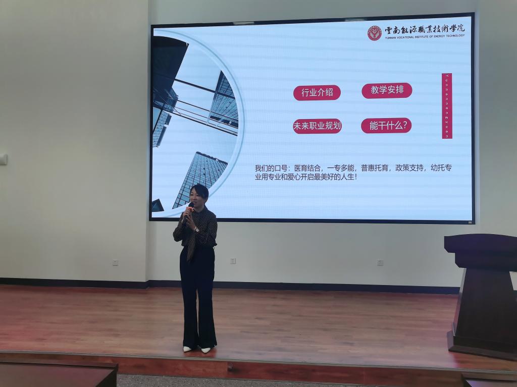 本专业带头人荣琴老师从托育服务相关政策出发,围绕专业培养目标、课程体系设置、职业面向、毕业条件等方面展开专业介绍。面对学生最关心的考证和就业问题,荣琴老师也从1+X证书制度、就业前景等进行了详细阐述。