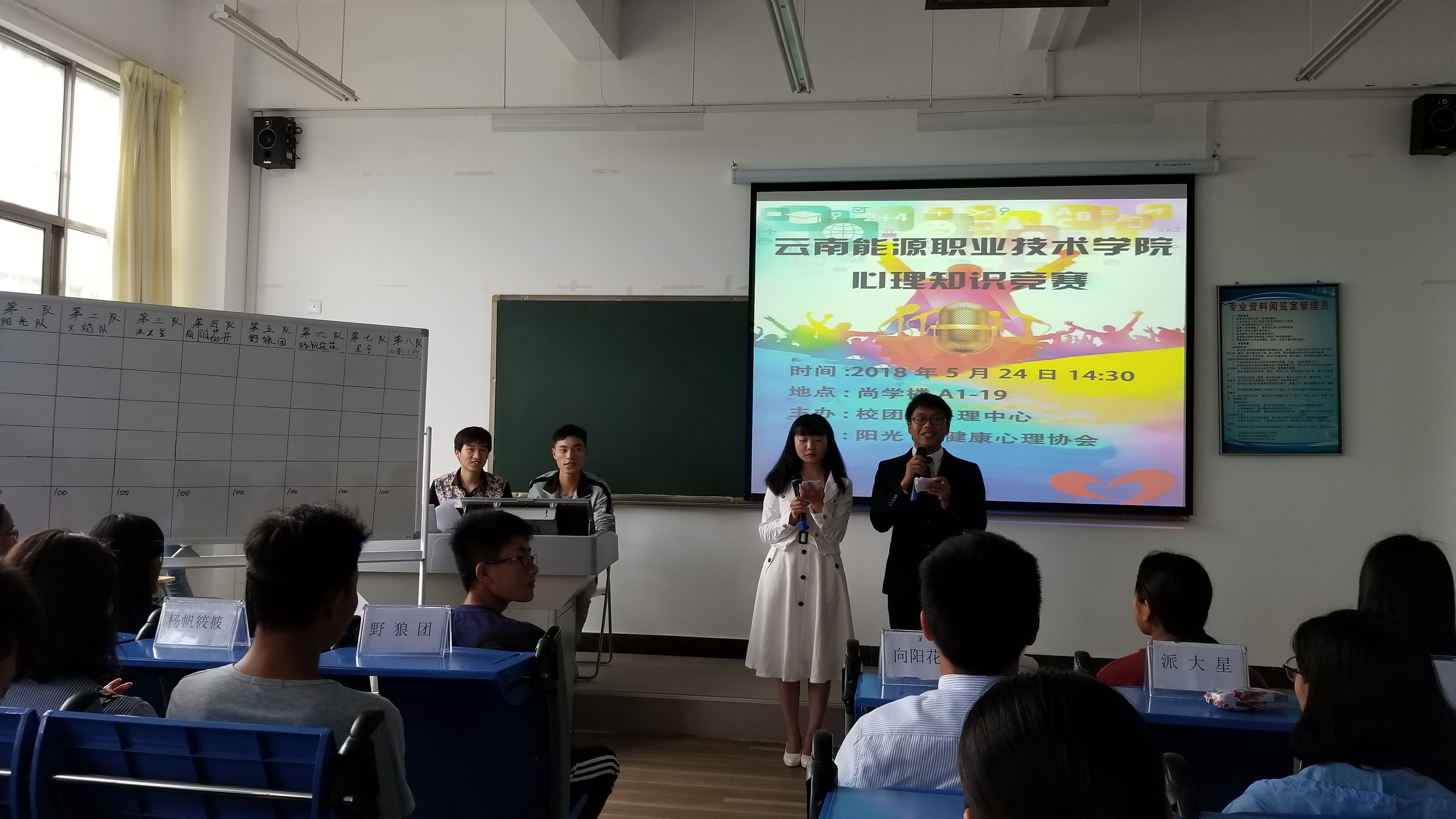 为提高大学生心理健康知识, 促进大学生全面协调发展, 我校于2018年5月24日14:30在尚学楼B1-16举行了心理知识竞赛,本次比赛由校团委心理中心主办,阳光・健康心理协会承办。