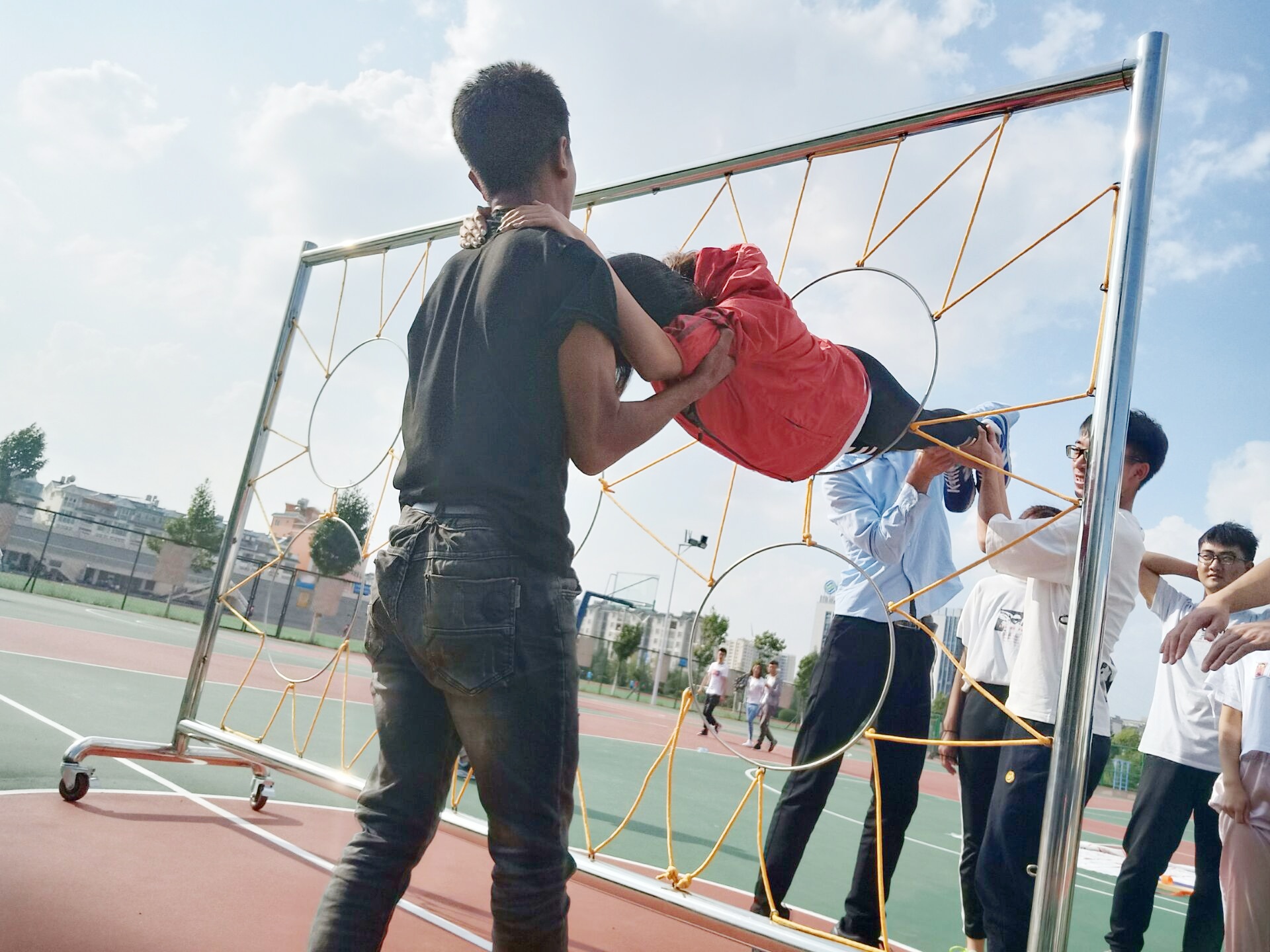 此次活动由“突破雷阵”“齐心协力”“相依为命”和“穿越电网”四个小活动组成。同学们在“突破雷阵”中展现出了团结协作的精神,在互帮互助中一步一步地突破自我走出了地雷区,在“齐心协力”中各自奉献力量,团结地走向胜利,在“相依为命”中散发着相互信任的光芒,在两两合作中走下了独木桥,最后在“穿越电网”中,林静老师绘声绘色的讲述了中国抗战时,士兵们为活命和取得胜利而危险地穿越电网的故事,同学们听着慷慨激昂的歌声,带着缅怀先烈勇于战斗、团结一致的精神参与此次活动,男同学保护着女同学,小心翼翼走向了胜利的曙光。