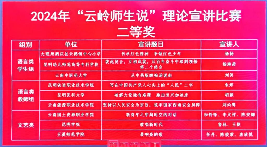 “云岭师生说”理论宣讲比赛由云南省委教育工委、云南省教育厅主办,该比赛作为云南省教育系统思政教育品牌活动之一,是推进大中小学思想政治教育一体化建设的重要举措。本次比赛围绕“沿着习近平总书记指引的方向阔步前进,奋力谱写中国式现代化云南篇章”的主题展开,分为语言类和文艺类两种形式。自今年4月启动以来,全省各校积极响应,师生们热情参与,掀起了一股学习、宣讲和应用理论的热潮,共计报送宣讲作品385个,经过层层选拔,最终来自全省各级各类学校的31组选手脱颖而出,进入决赛。