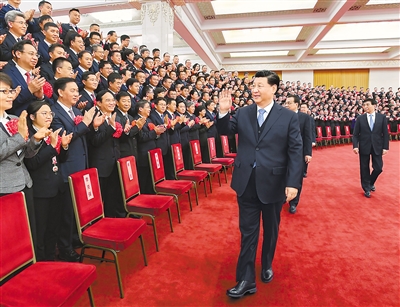 下午3时30分,习近平等来到人民大会堂北大厅,全场响起热烈掌声。习近平等向代表们挥手致意,同大家亲切交流并合影留念。