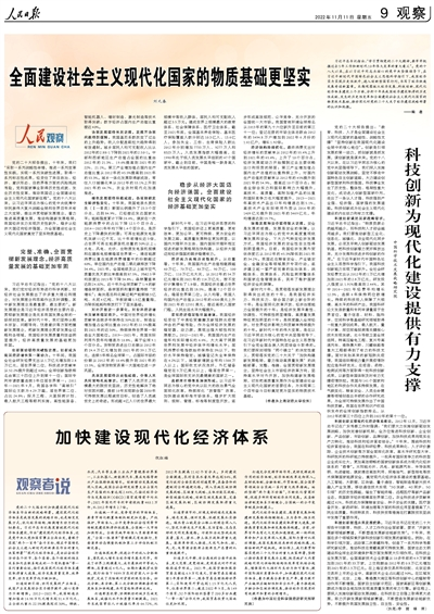 党的二十大报告提出,十年来,我们“采取一系列战略性举措,推进一系列变革性实践,实现一系列突破性进展,取得一系列标志性成果,经受住了来自政治、经济、意识形态、自然界等方面的风险挑战考验,党和国家事业取得历史性成就、发生历史性变革,推动我国迈上全面建设社会主义现代化国家新征程”。党的十八大以来,以习近平同志为核心的党中央统筹中华民族伟大复兴战略全局和世界百年未有之大变局,提出并贯彻新发展理念,着力推进高质量发展,推动构建新发展格局,我国经济实力实现历史性跃升,稳步从经济大国迈向经济强国,为全面建设社会主义现代化国家奠定了坚实物质基础。