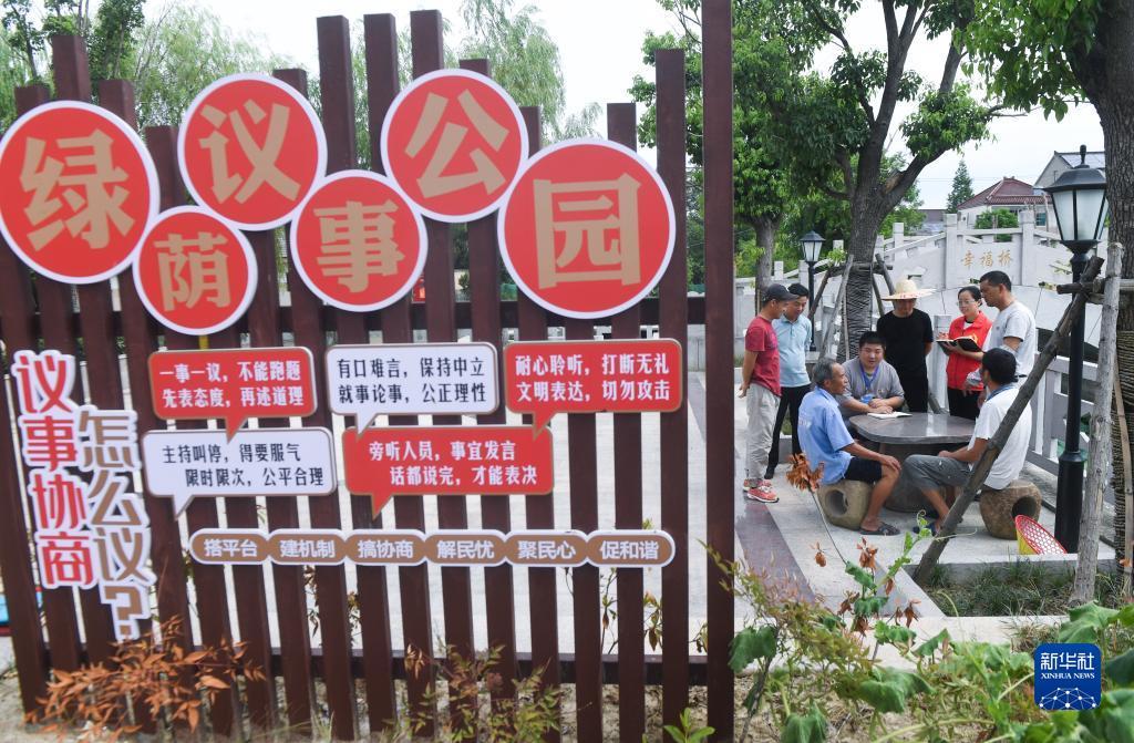 在浙江省湖州市长兴县吕山乡龙溪村的议事公园内,田园议事会成员开展讨论协商(2022年7月21日摄)。新华社记者 徐昱 摄